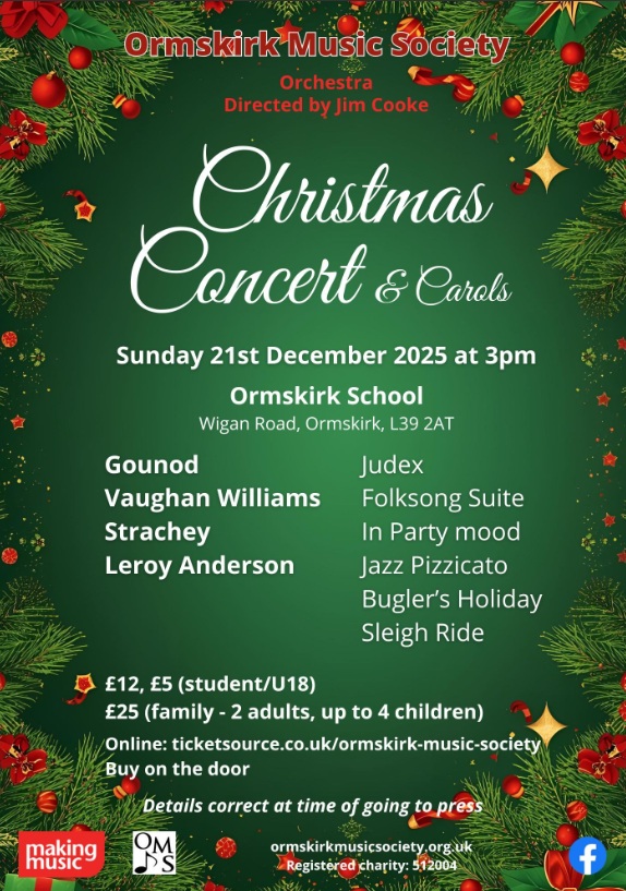 Sunday 21 December 2025 at 3pm at Ormskirk School, Wigan Rd, Ormskirk, L39 2AT