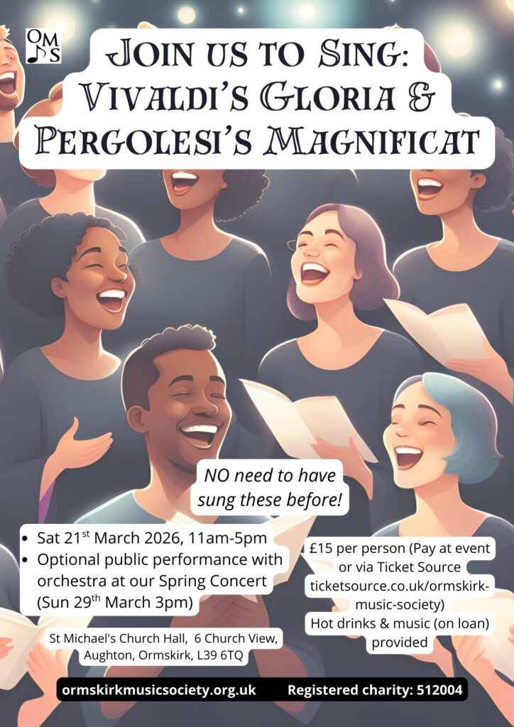 Ormskirk Music Society is running a workshop to learn and practise singing two magnificent (do you see what we did there?) choral works, ahead of our Spring Concert.